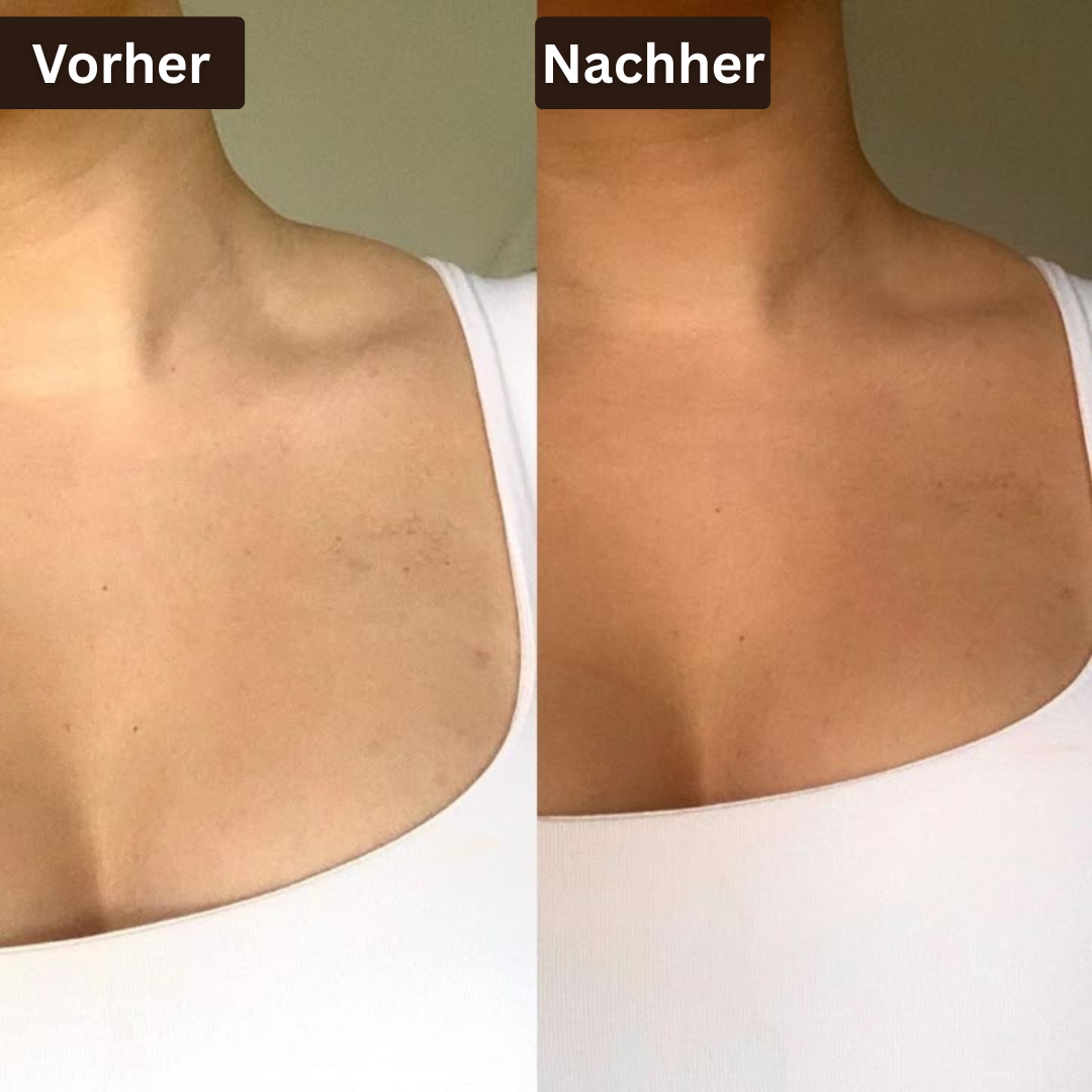 Durch die tägliche Einnahme (einfach 4–5 Tropfen in Wasser geben und trinken) wird deine Haut von innen heraus Schritt für Schritt dunkler – gleichmäßig, streifenfrei und ganz ohne Sonne.